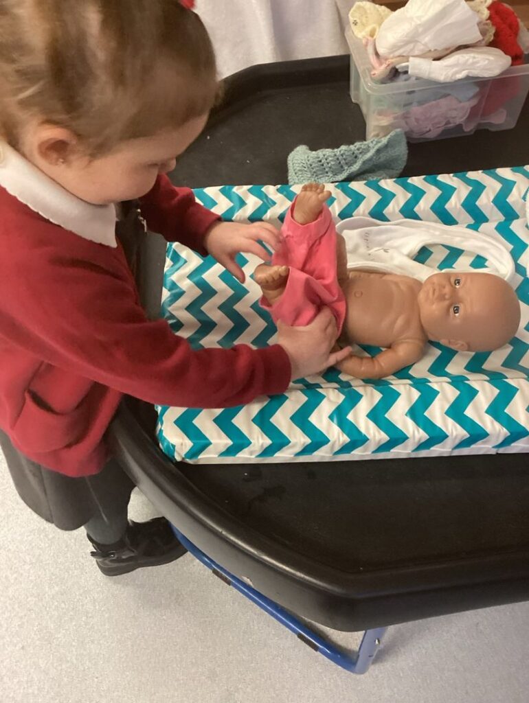 Bathing and caring for our babies has been a big hit in the water area and the children have also played Guess the Baby where they matched up photographs of their classmates when they were babies. This led to a discussion about the differences between when they were babies to now in terms of the things they eat, wear, move around and communicate.