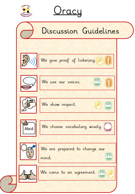 Discussion Guidelines (speaking and listening) are used in every class and based on the progression guidelines developed for our school, in line with our wider curriculum. The class guidelines are updated regularly to reflect oracy development.
