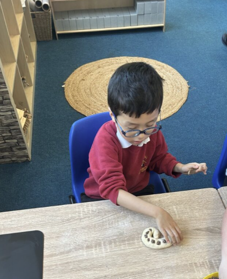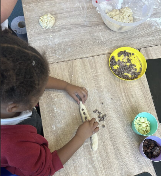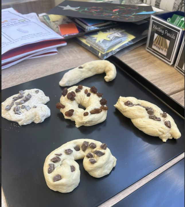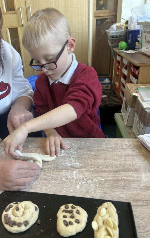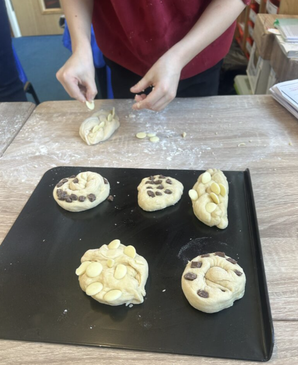 Finally, we followed a recipe to make a Challah bread dough. We used flour, eggs, honey, yeast and water to make our dough . Once the dough had risen, we created our shapes and added our toppings. The toppings we could choose from were, milk chocolate chunks, white chocolate buttons or raisins. We then baked our bread in the oven till it was golden brown and then we got to taste it!