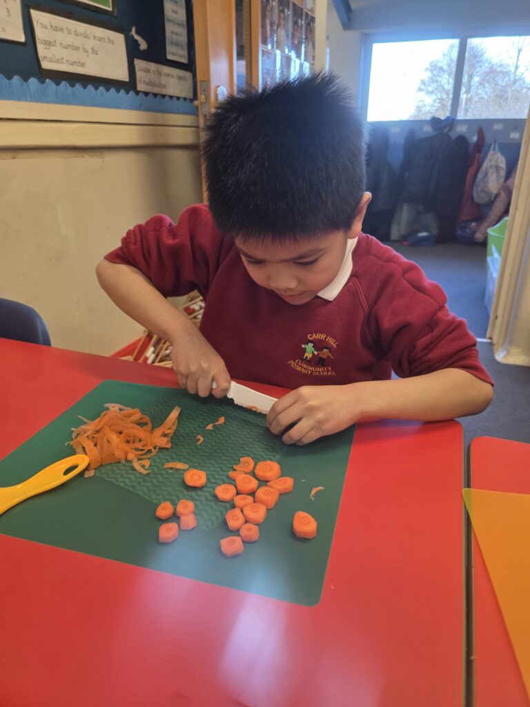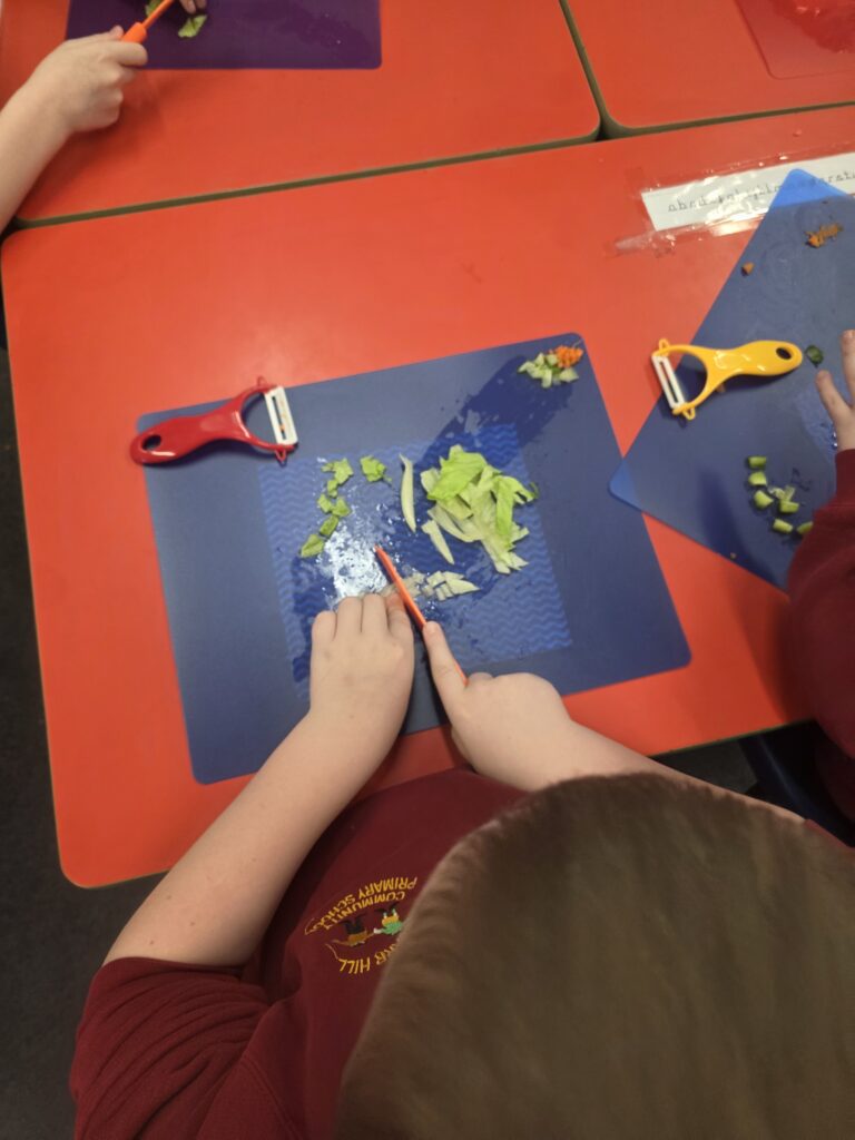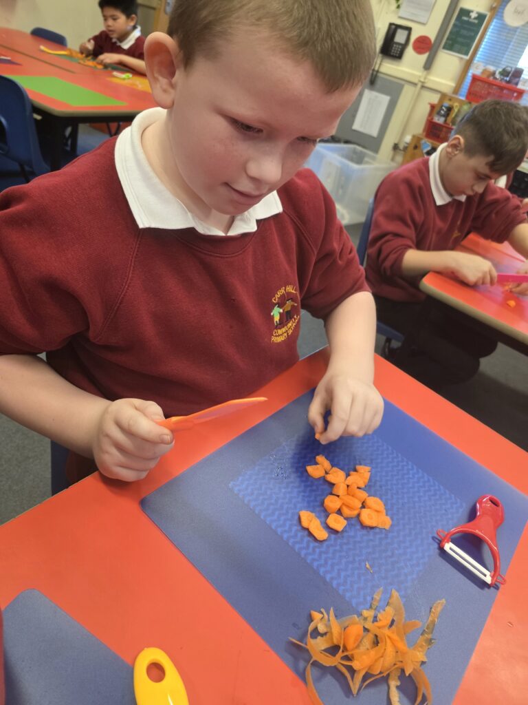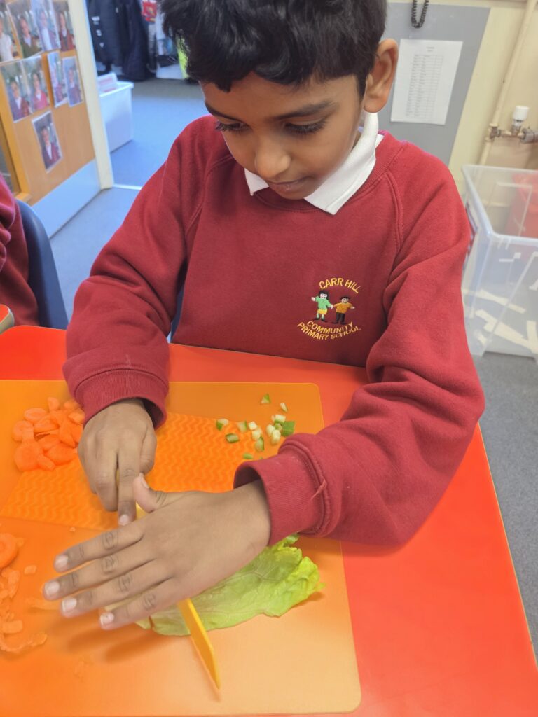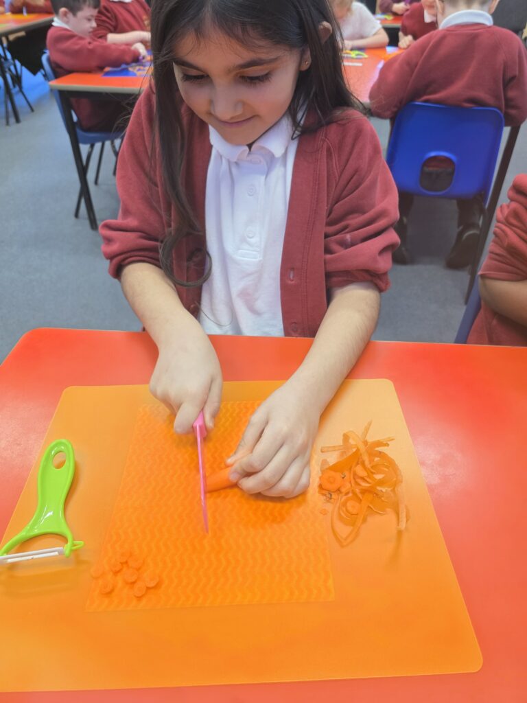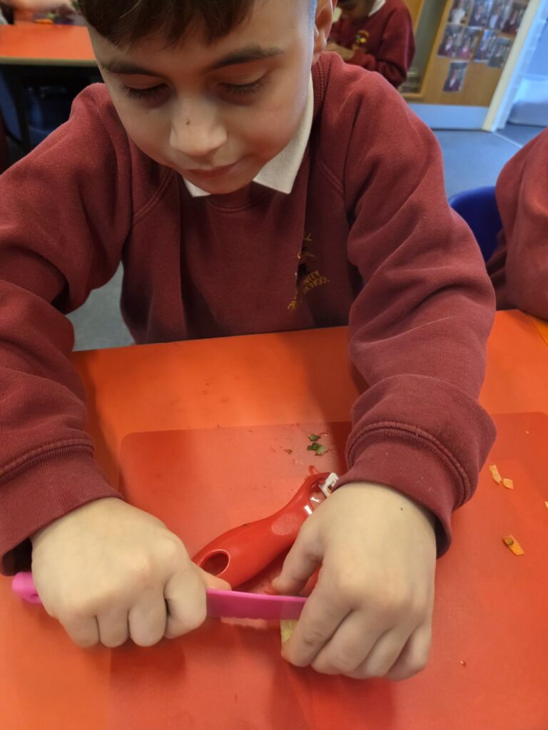 In Year 3, we have been learning how to safely and hygienically prepare foods! We learnt how to peel and use three different cutting skills: bridge hold, claw and cross chop.